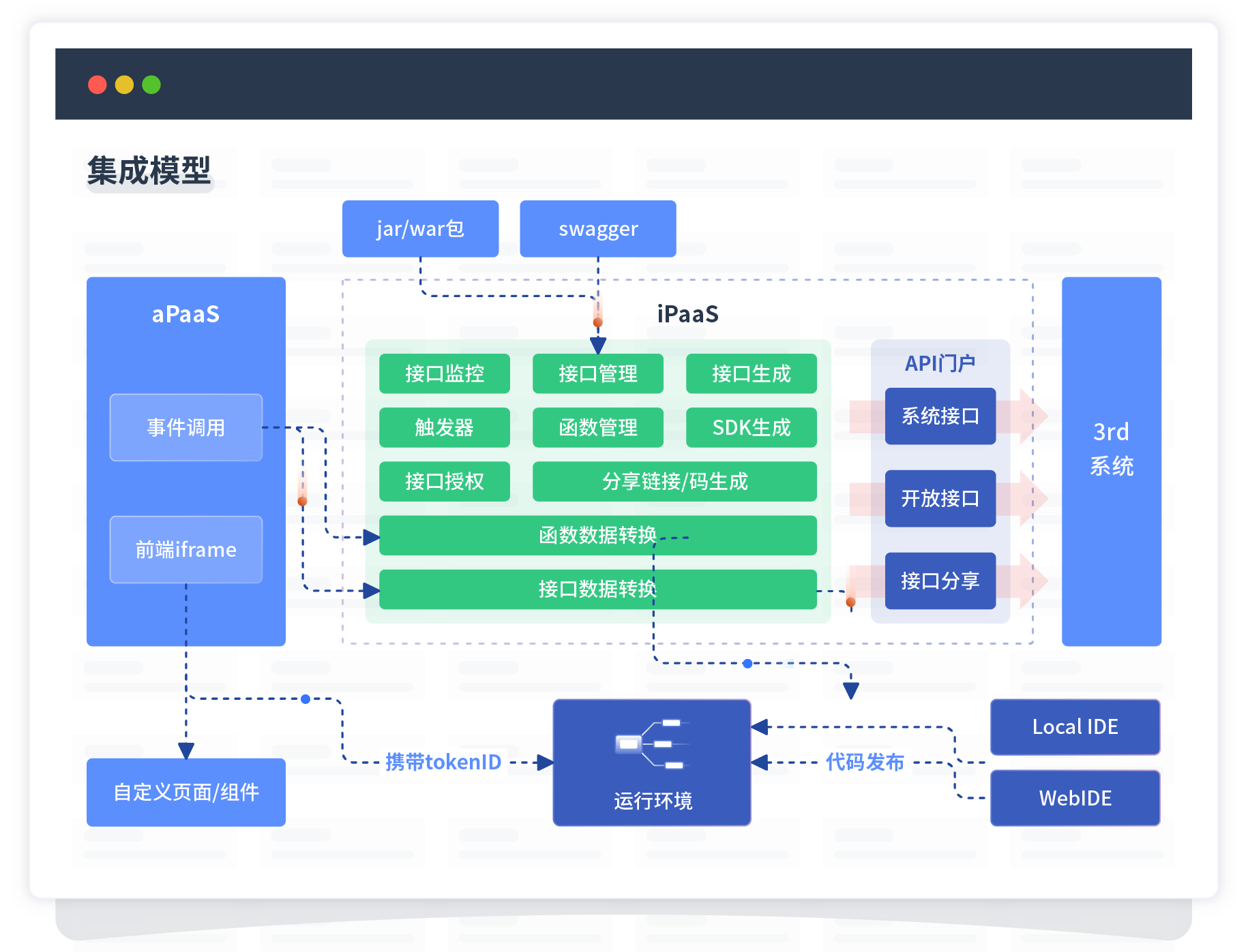集成模型包括平台本身前、、、、、、、、后端能力的扩展,,,,,,,,,,也支持通过API门户和第三方系统进行交互。。。。。。