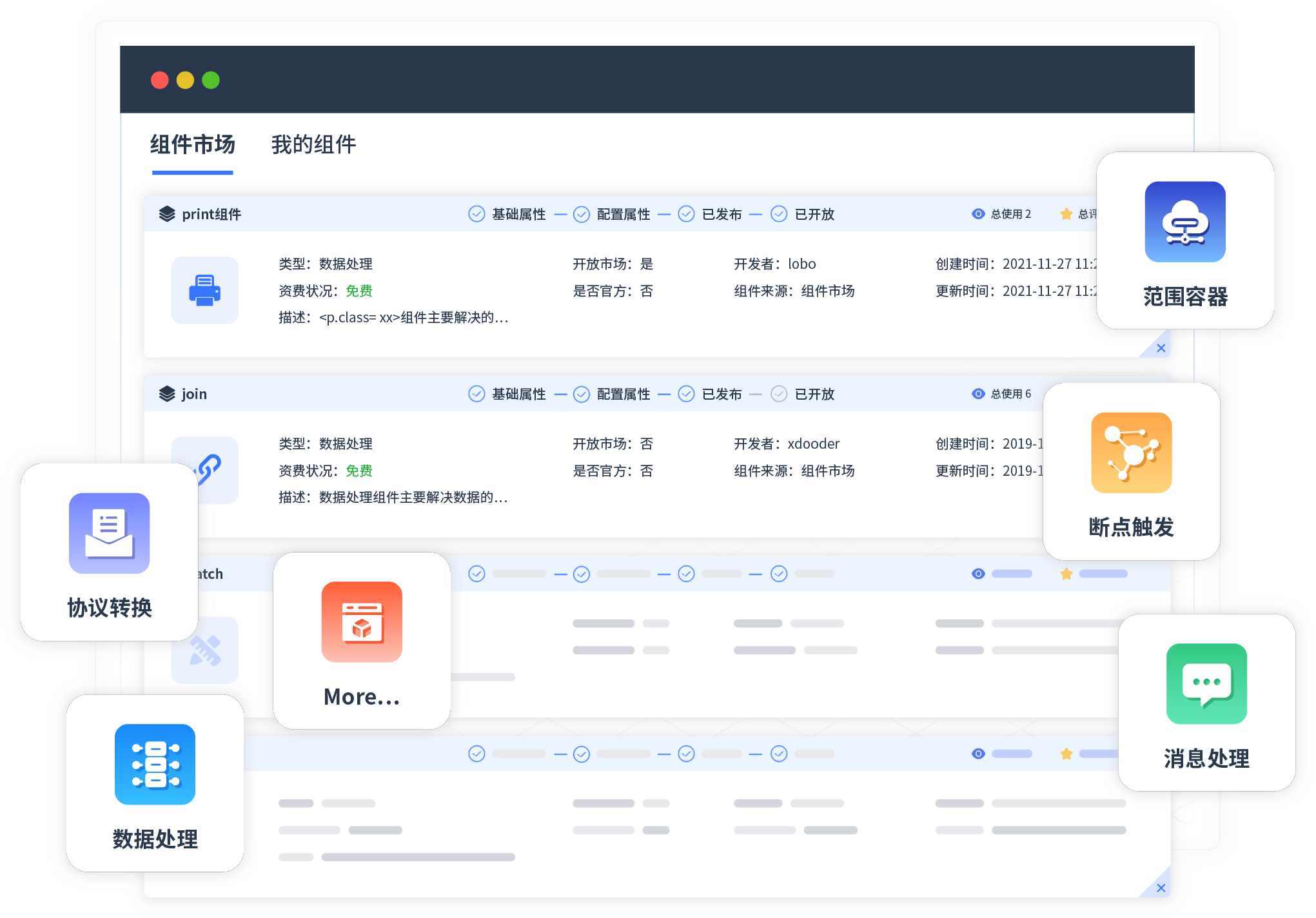 针对集成场景,,,,,,,,OPPO钱包提供组件市场,,,,,,,,,,例如协议转换、、、、、、、、、、、消息处理、、、、、、、、、、、、、文件操作等。。。。。。。。除平台提供的组件外,,,,,,,,,,,,,,,客户可以自定义所需组件。。。。。